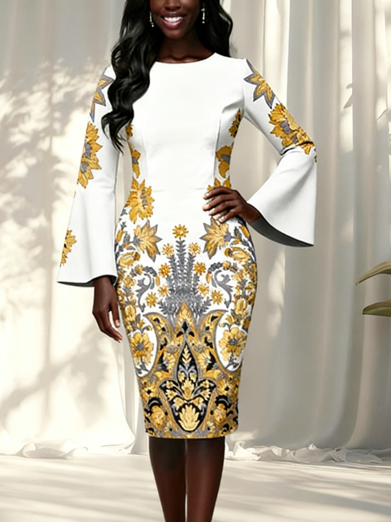 Bohemian 3D Floral & Geometric Print Pencil Skirt - A-Line Midi Length Long Sleeve-like Fit (No Waistband) Round Neck Short Dress Skirt for to Party Outfits, Psychedelic 60s/70s Style (Hand Wash/Dry Clean)