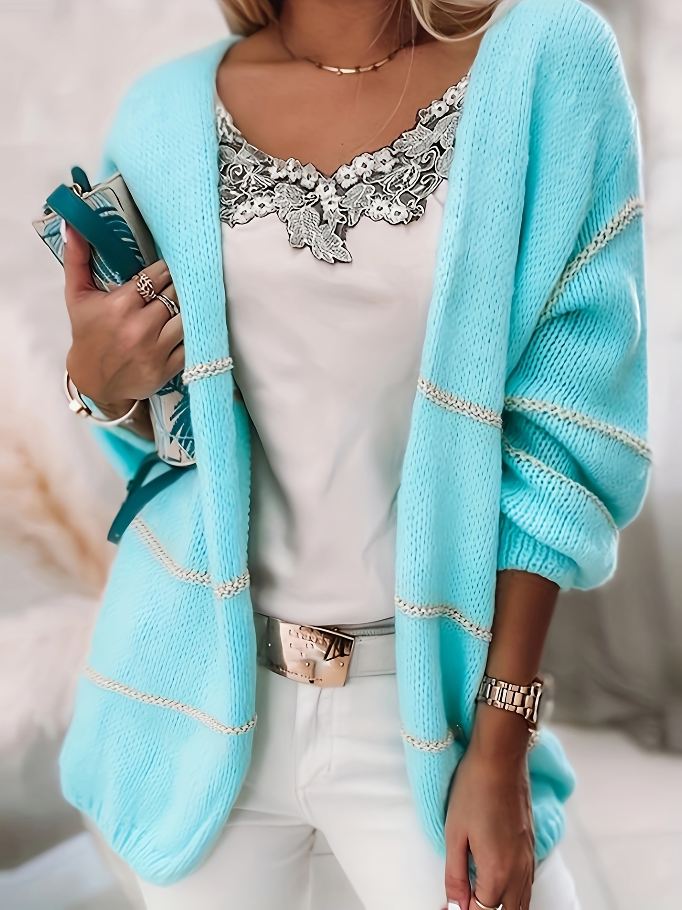 [Chic Cardigan] Plus Size Women's Chic Color-Block Striped V-Neck Cardigan | Long Sleeve, Beige & White, Casual Fall/Winter Outerwear with Lace Detail, Lace Trim