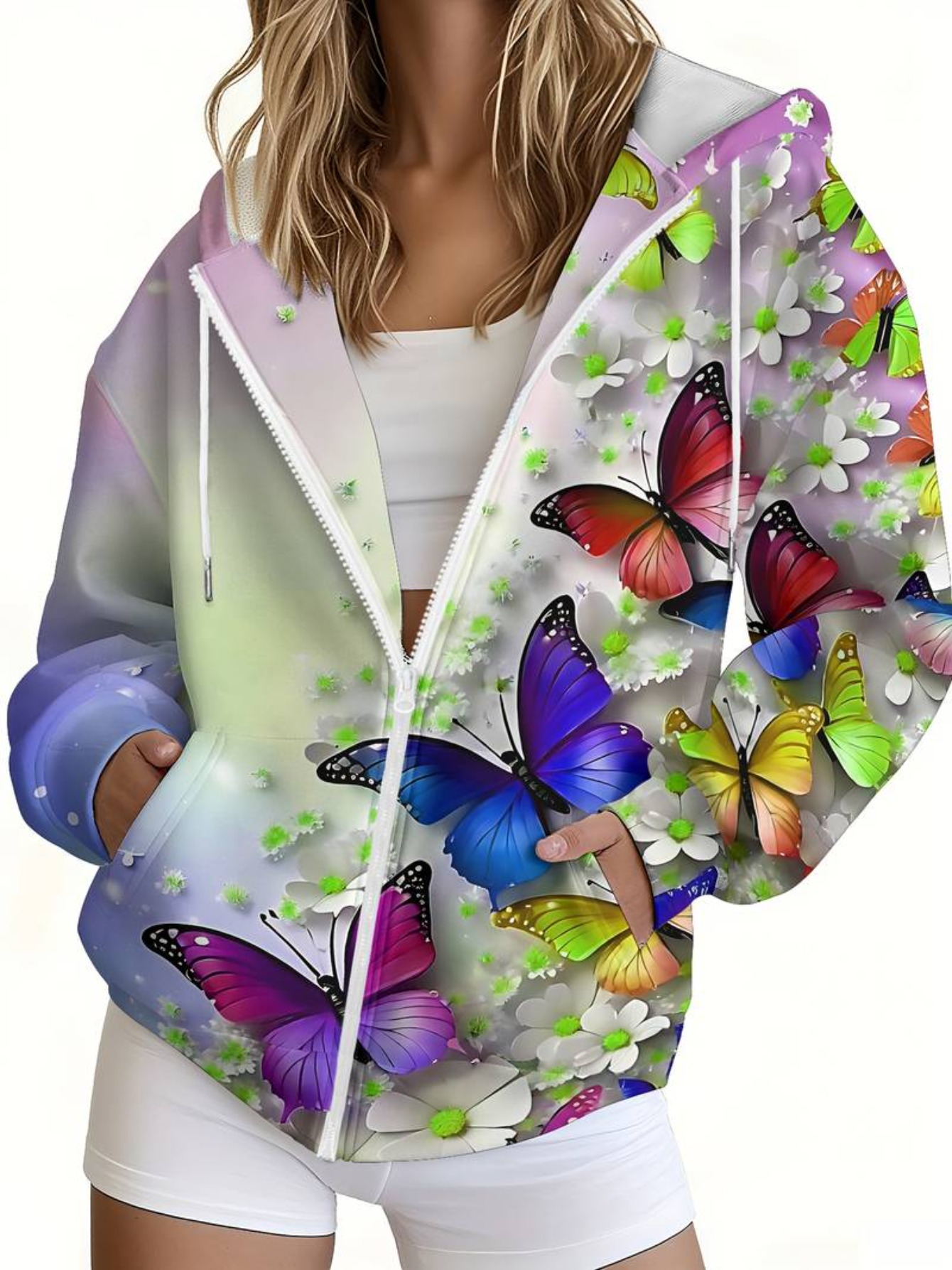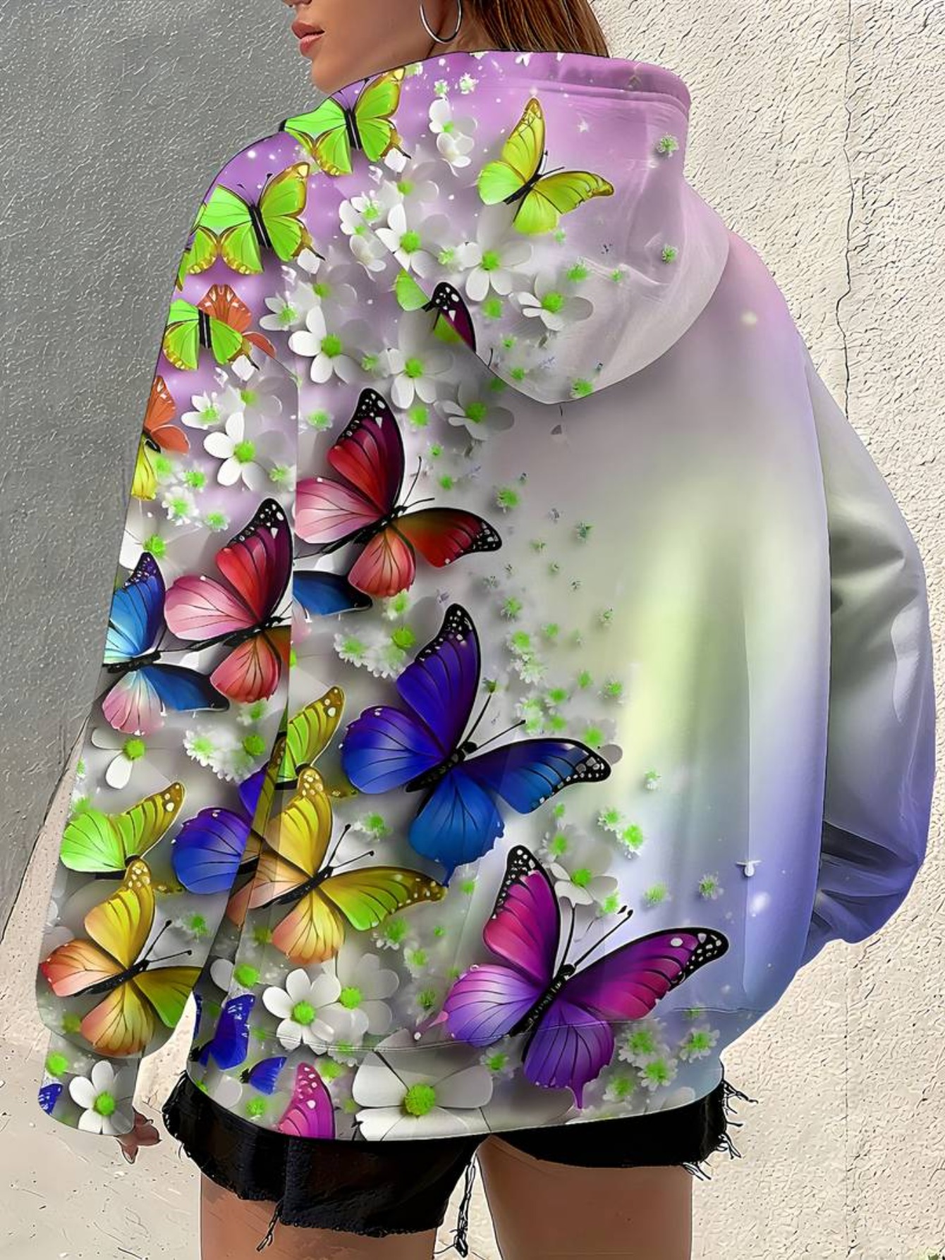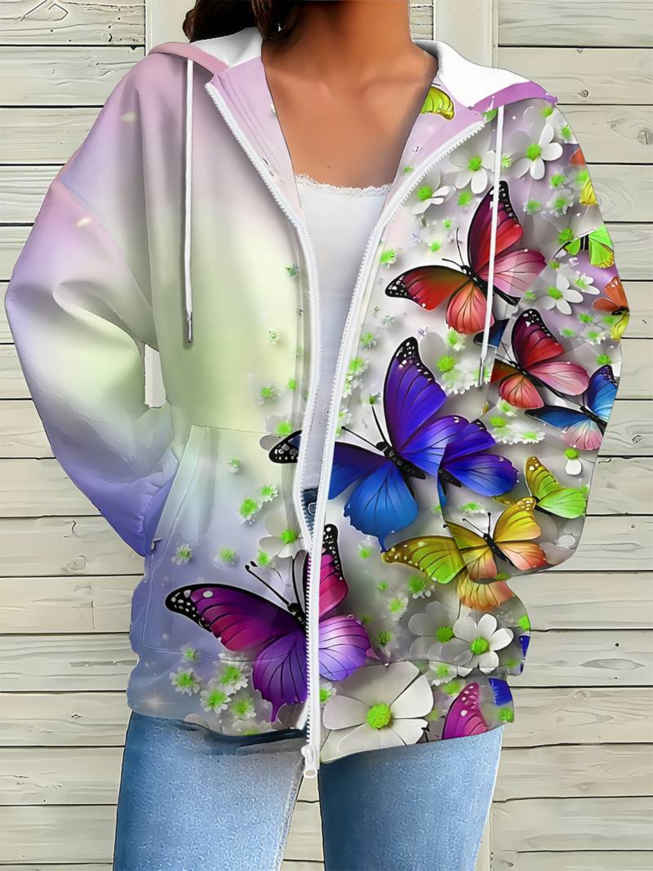 Plus Size Women'S 3D Butterfly & Floral Print Zip-Up Hoodie Jacket - Oversized Loose Fit Retro V-Neck Sweatshirt with Pockets, Long Sleeve Full-Zip Front, Multicolor All-Over Print (PinkPurple/Yellow/Green/Orange) for Fall Winter Warmth