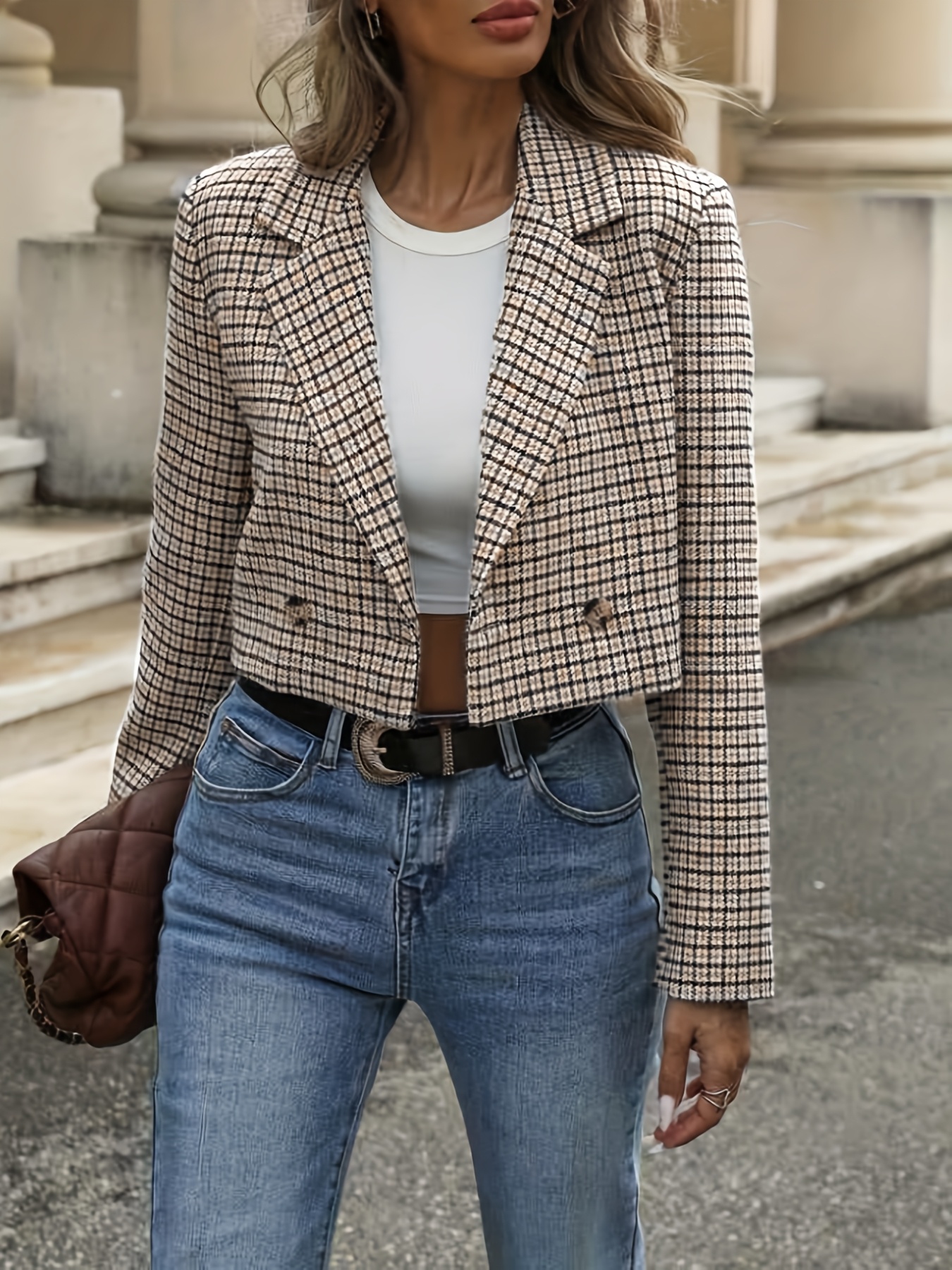 Women'S Houndstooth Blazer Jacket - Elegant Office to Party Coat, Structured H-Silhouette Blazer for Fall/Winter, Button-Front Closure, Professional & Formal Events - Women'S Business Jacket, Winter Outerwear, Stylish Outerwear, Durable Fabric