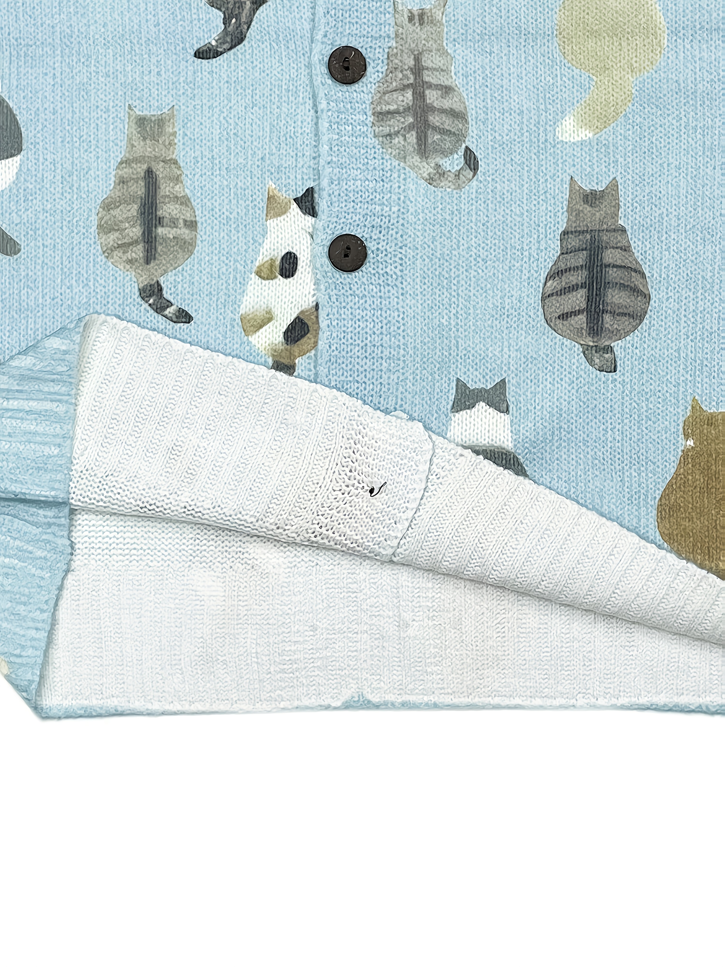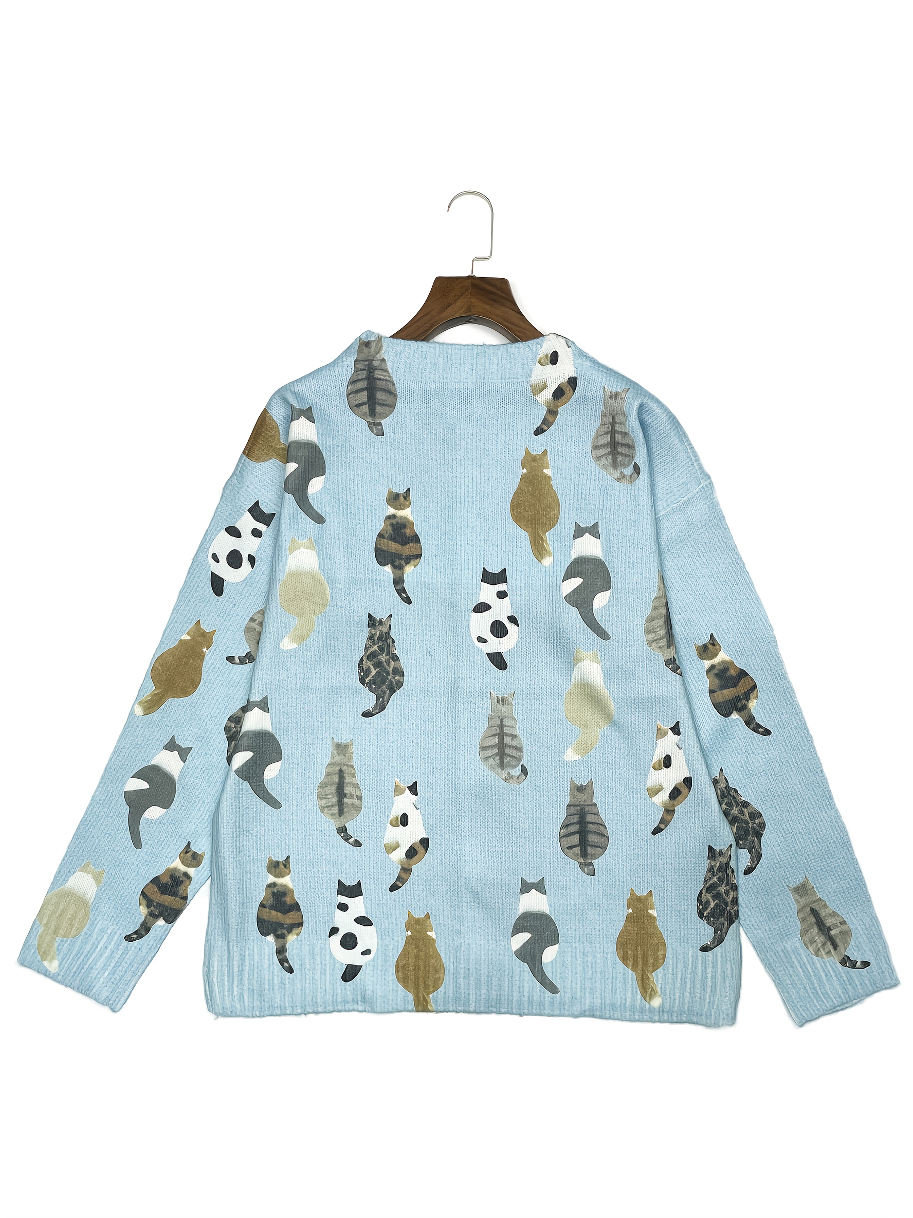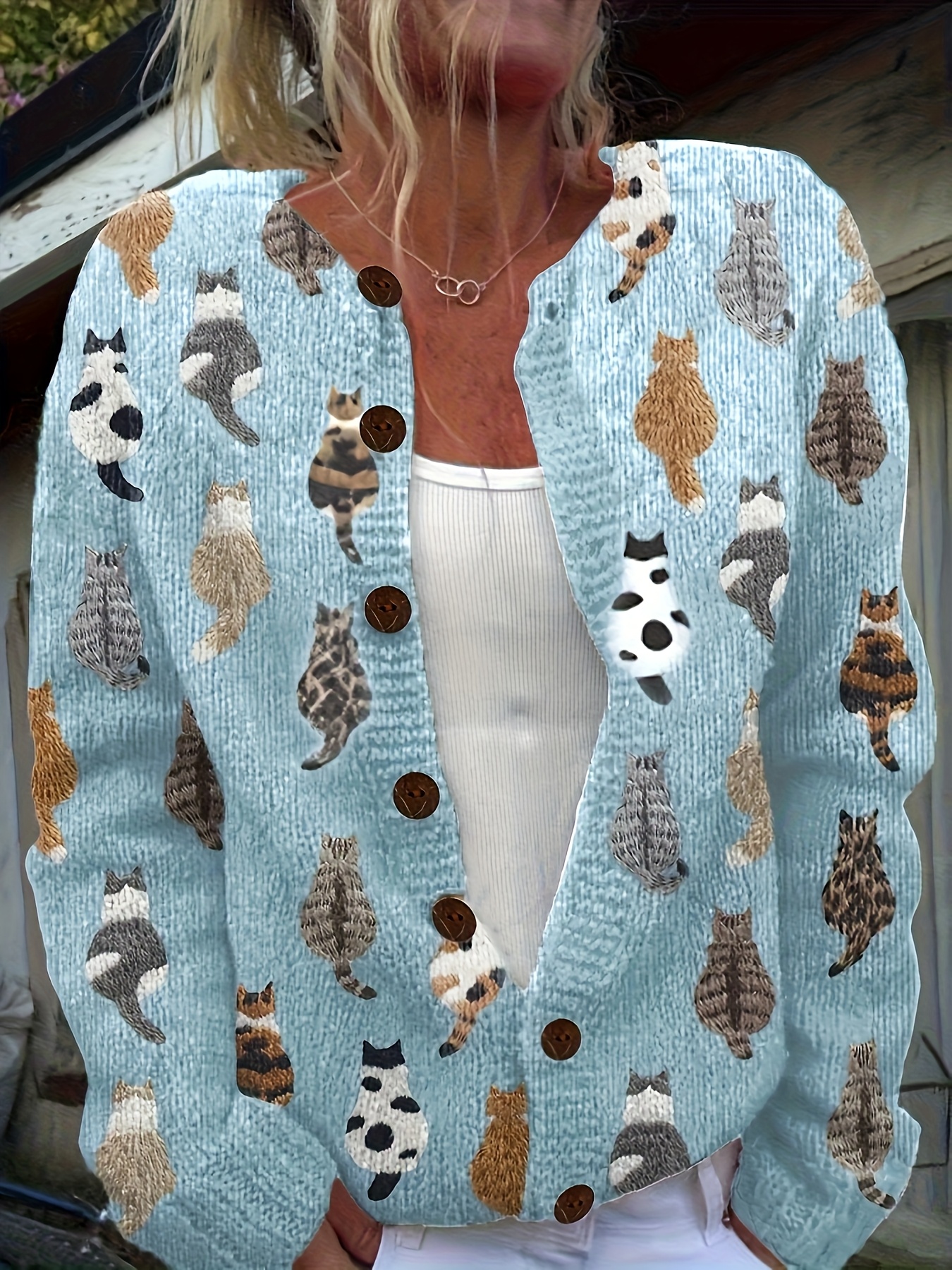 Plus Size - 2D FLAT PATTERN Plus Size, All-printed Elegant Cardigan Jacket For Cats And Dogs, Elastic Round Neck Button-front Lightweight Autumn And Winter Jacket For Women, Casual Jacket For Pet Lovers