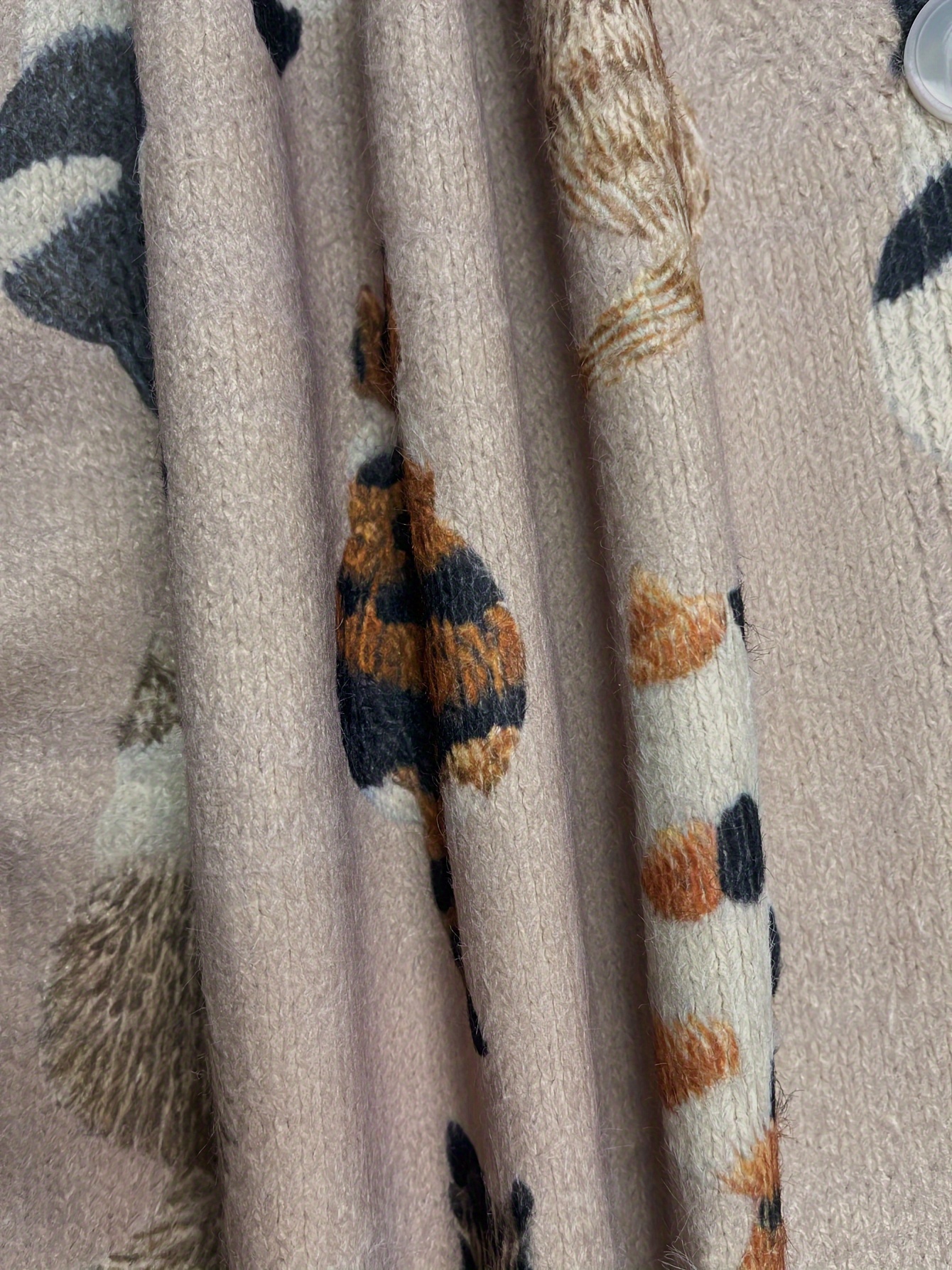 Plus Size - Plus Size Women'S Cozy Cat Print V-Neck Cardigan - Long Sleeve, Button-Up, Casual Fall/Winter Sweater with Pockets, Brown & White Cat Design, Perfect for Casual Attire, Cozy Fall Wear | Playful Print Cardigan | Construction