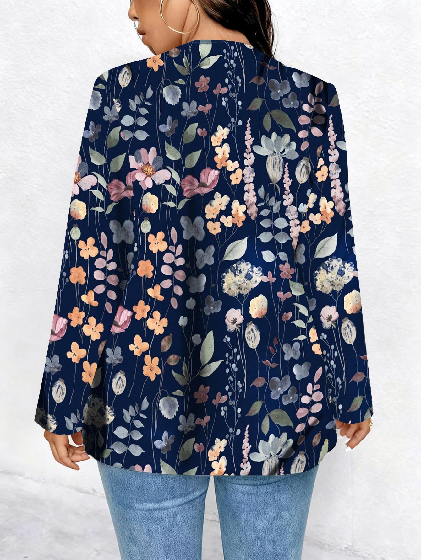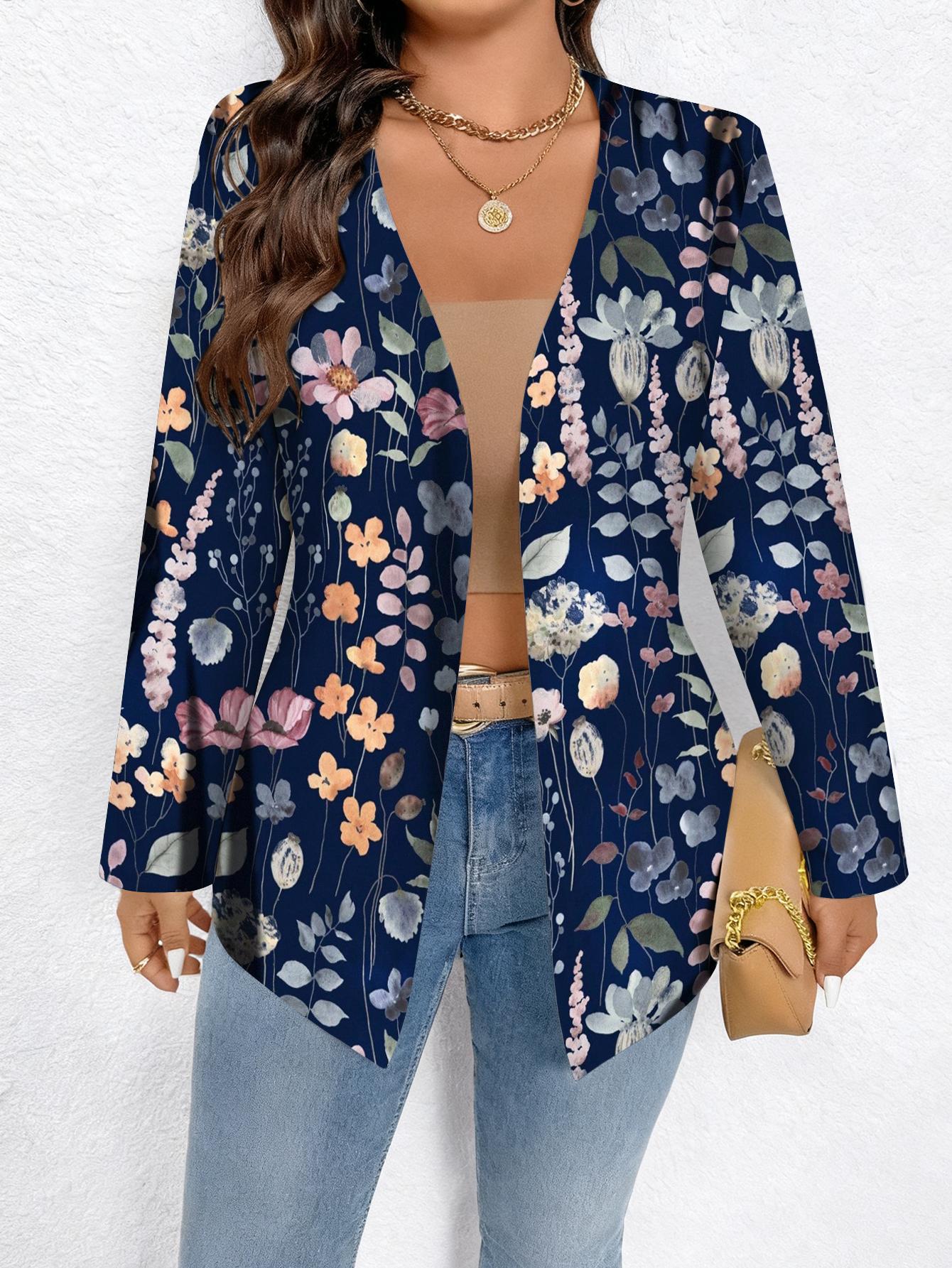 Plus Size - Plus Size Women'S Navy & Multicolor Floral Print Milk Silky Cardigan - Elegant Casual Soft Draping Coat with Fit, Machine Washable Round Neck Sweater for Fall Winter, Daily Commute, Dating & Social Events, Wrinkle-Resistant Layering Piec