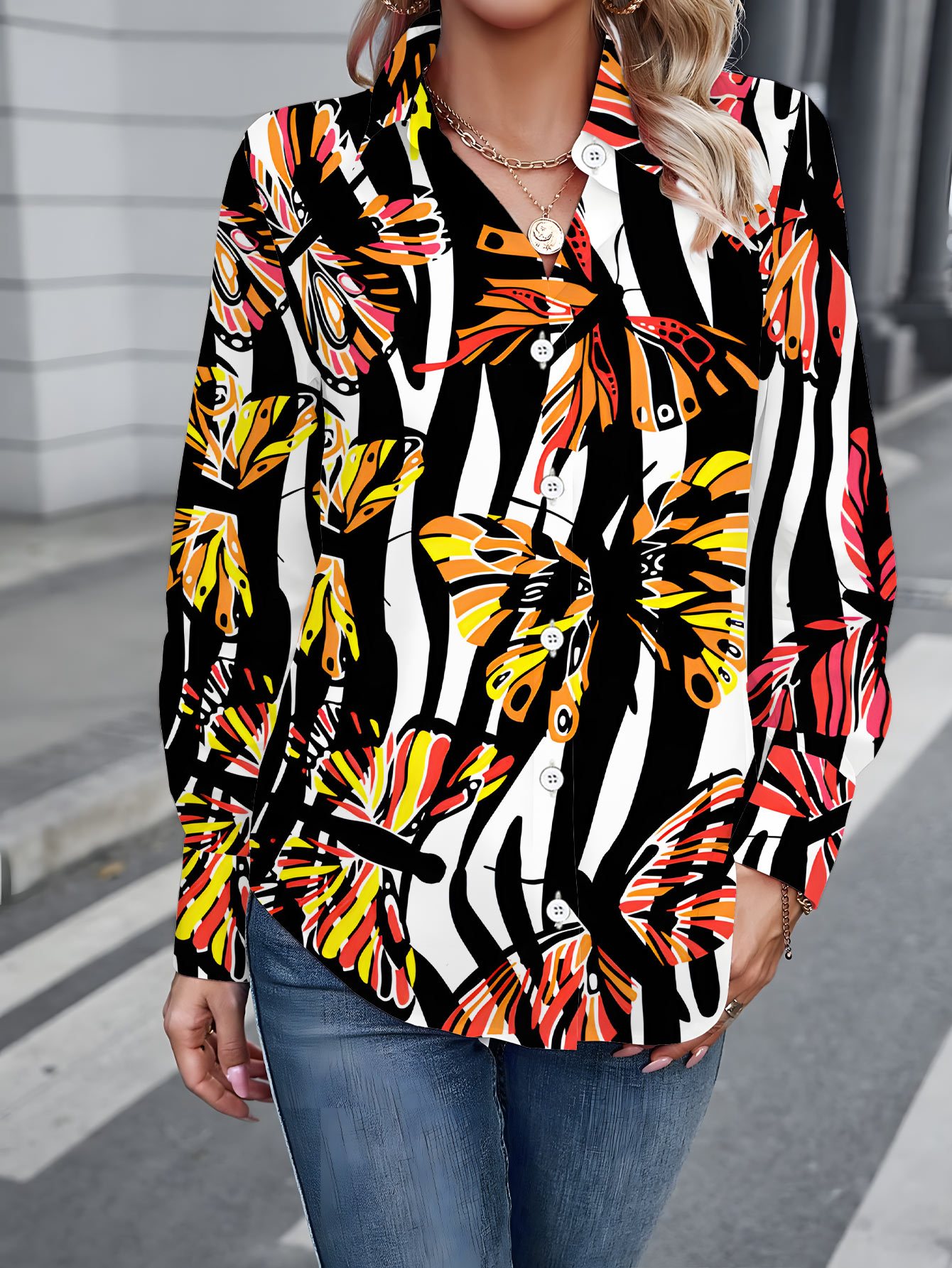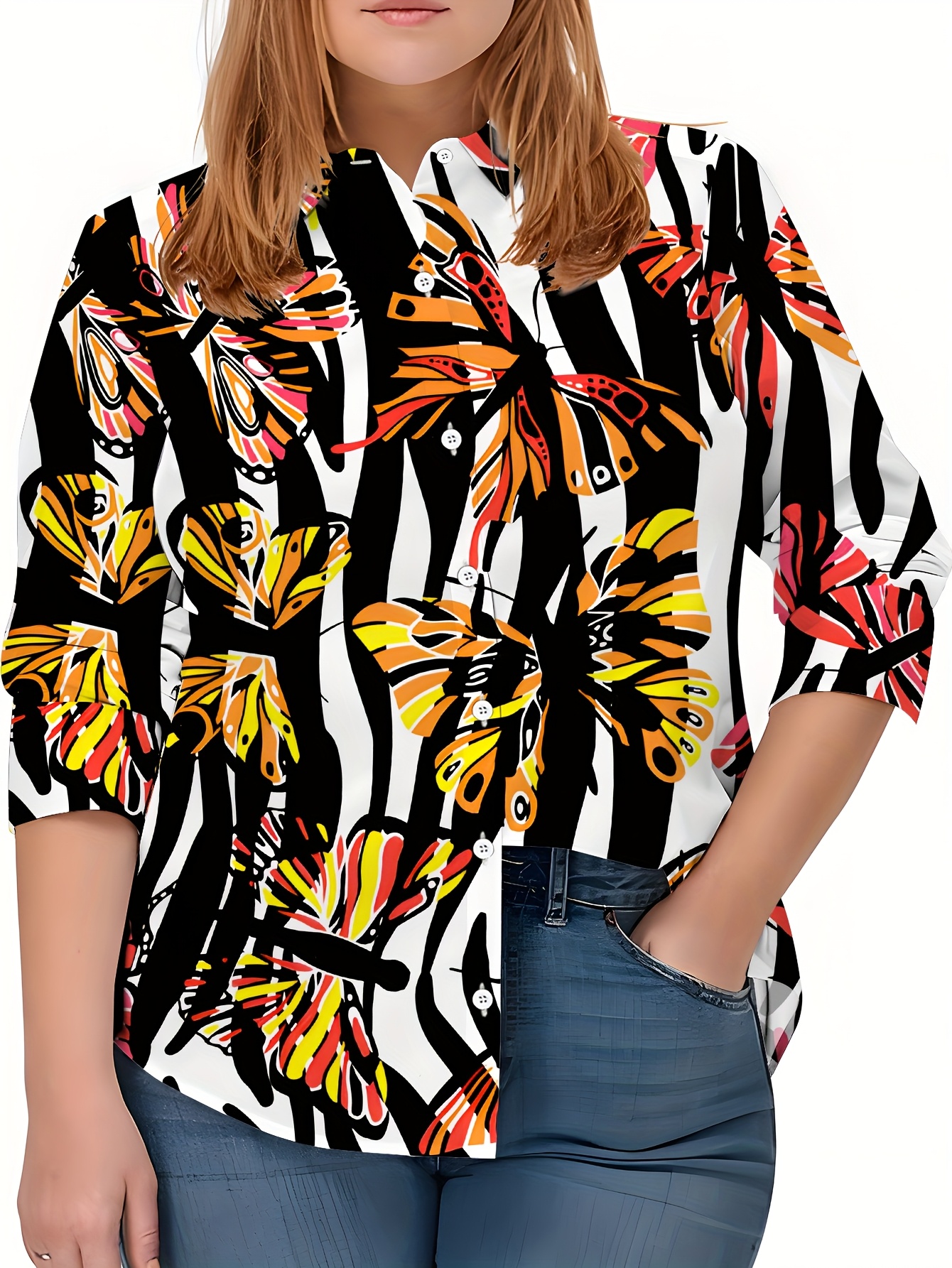 Plus Size Women'S Long Sleeve Butterfly Print Blouse | Black & White Contrast 3D Floral Design, Soft Comfortable Light Beige-Friendly Fabric, Casual Button-Up Shirt for Spring & Fall, Versatile Layering Piece, Allseason Blouse, Floral Print Top