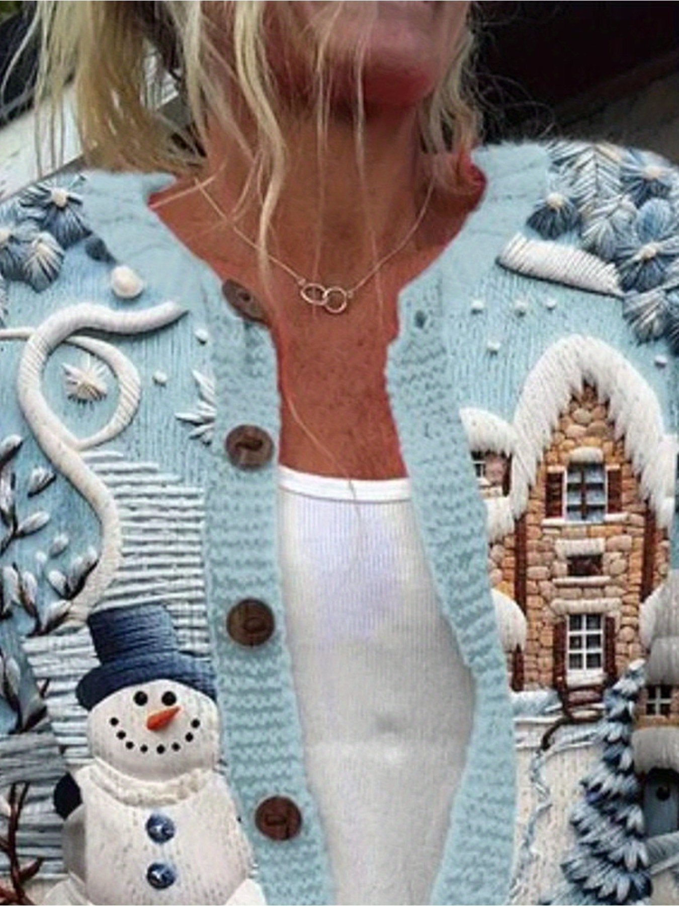 Plus Size Women's XL to 6XL Elegant Cardigan Sweater - Winter Snowman & Snow House Button-Front Closure, Lightweight Warm Long Sleeve Round Neck Coat, Casual Fall Winter Outfits Christmas New Year Gift