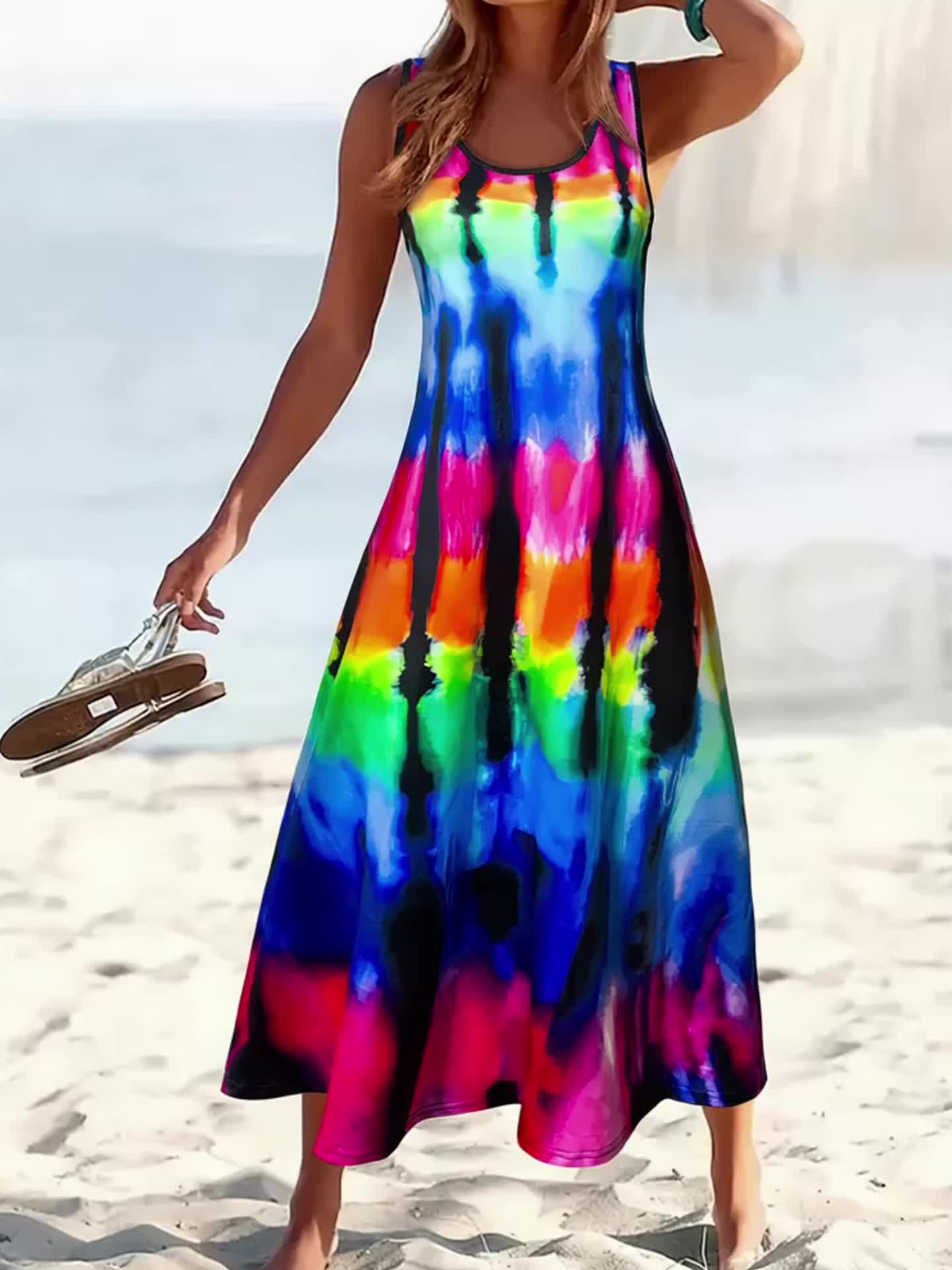 [Tie-Dye Beach Dress] Vibrant Tie-Dye Print Women's Sleeveless Dress | Lightweight Breathable Round Neck, Machine Washable, Spring Summer Beach Vacation Casual Outfit - Blue Yellow Pink Purple on Black Background Fabric