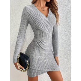 Stylish Solid Color Bodycon Knit Dress - Elegant V-Neck, Ribbed Surplice, Long Sleeve, Mid-Elastic Polyester Fabric, Machine Washable, Perfect for Spring, Summer, and Fall Seasons