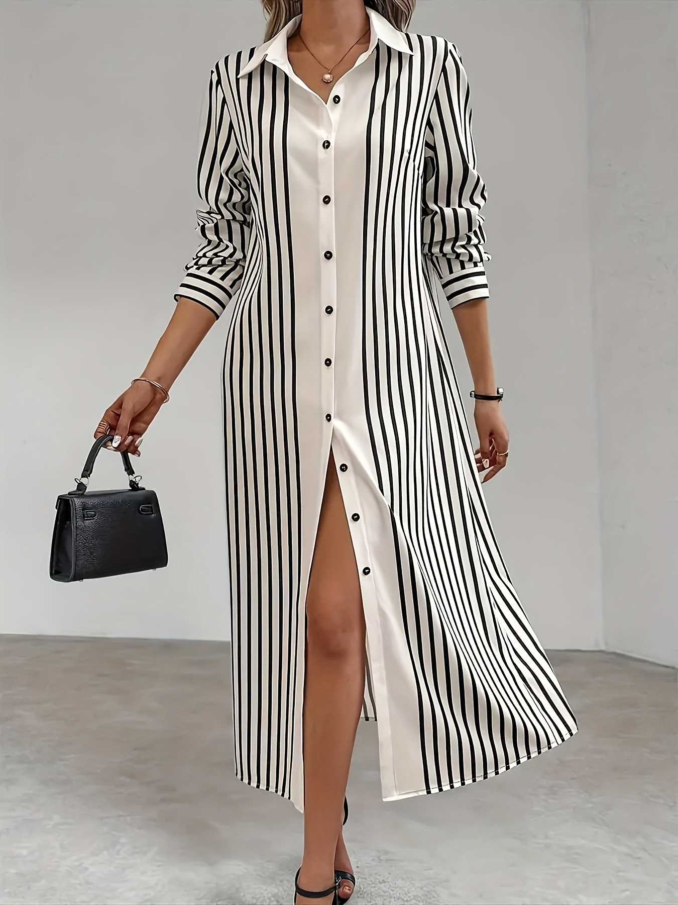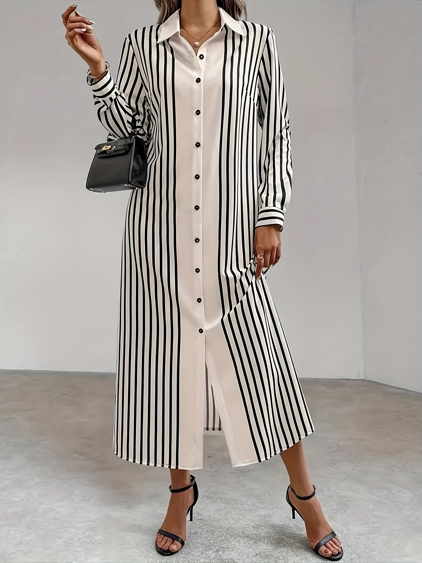 Women's Elegant A-Line Dress with Striped Cardigan & Mid-Length Dress - Asymmetrical Hem, Collar, Loose Fit, A-Line Silhouette, Straight Sleeve Cardigan for Spring/Autumn Wear, Machine Washable Dress Suitable for, Semi-Formal Events
