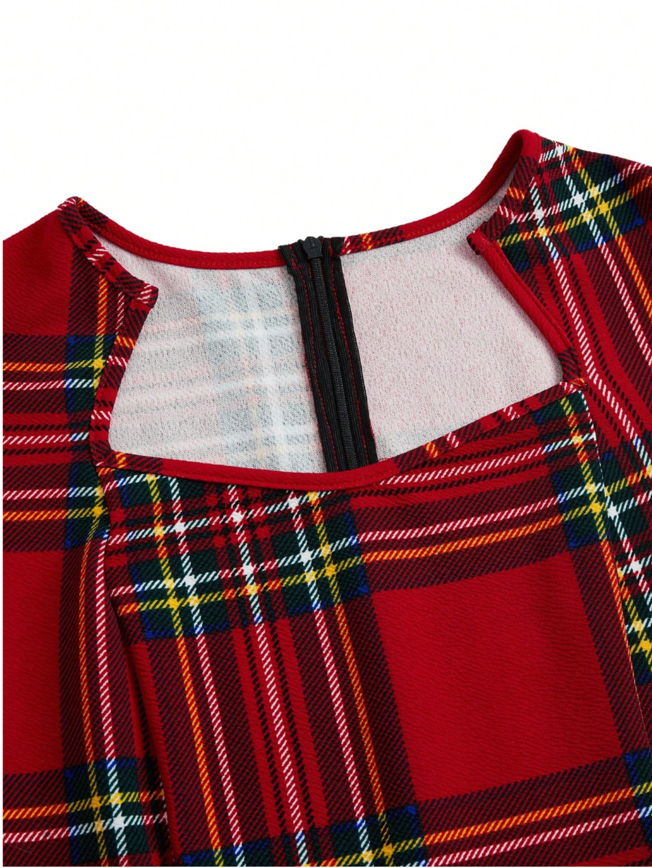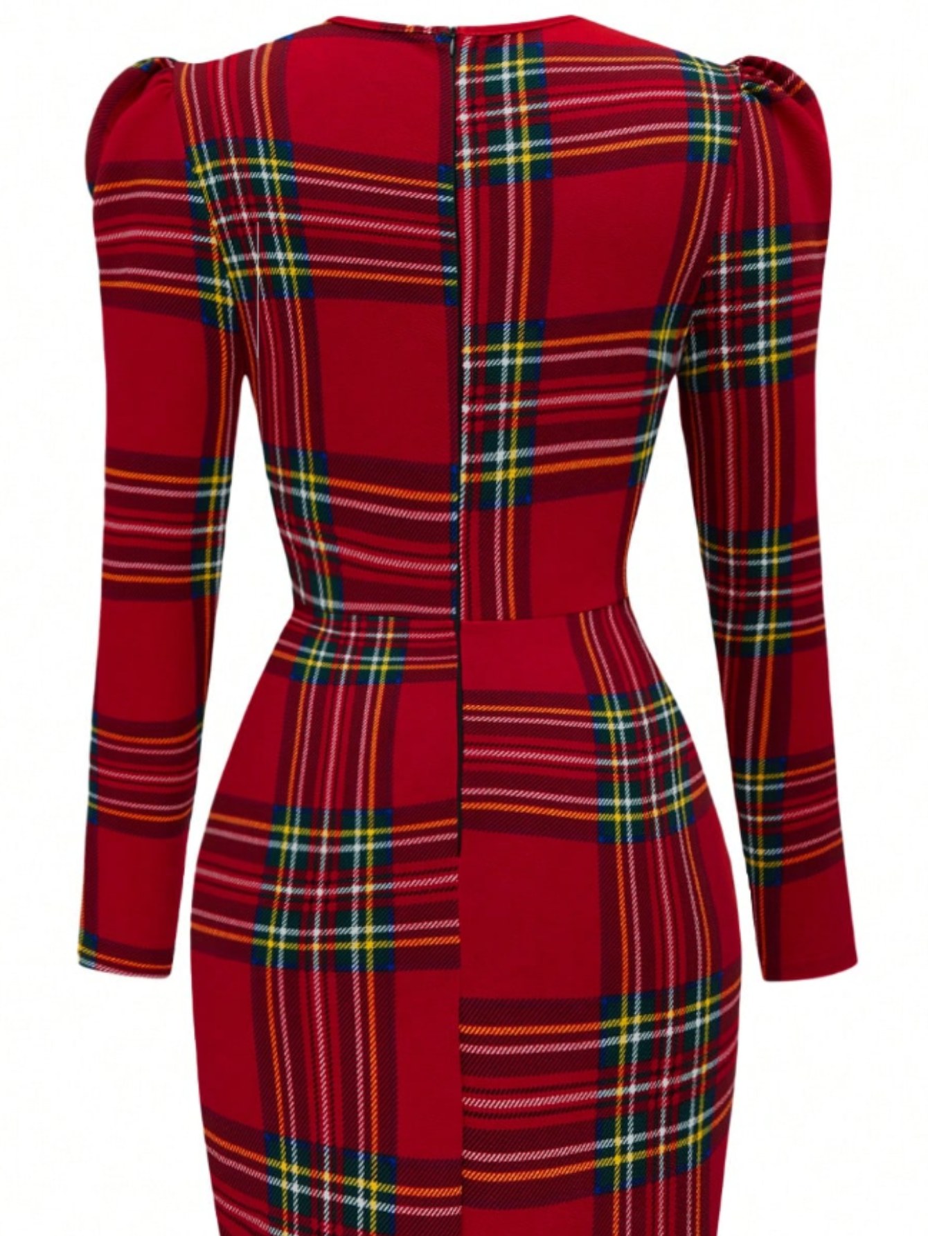 Women'S Elegant Christmas Plaid Bodycon Dress - Long Sleeve Puff Shoulder Red Tartan Checkered Pattern with Zipper Back, Boat Neck Winter Party Dress, Structured Fitted Silhouette for Xmas, New Year'S Eve & Holiday Events - Red/Green Tartan Checkere