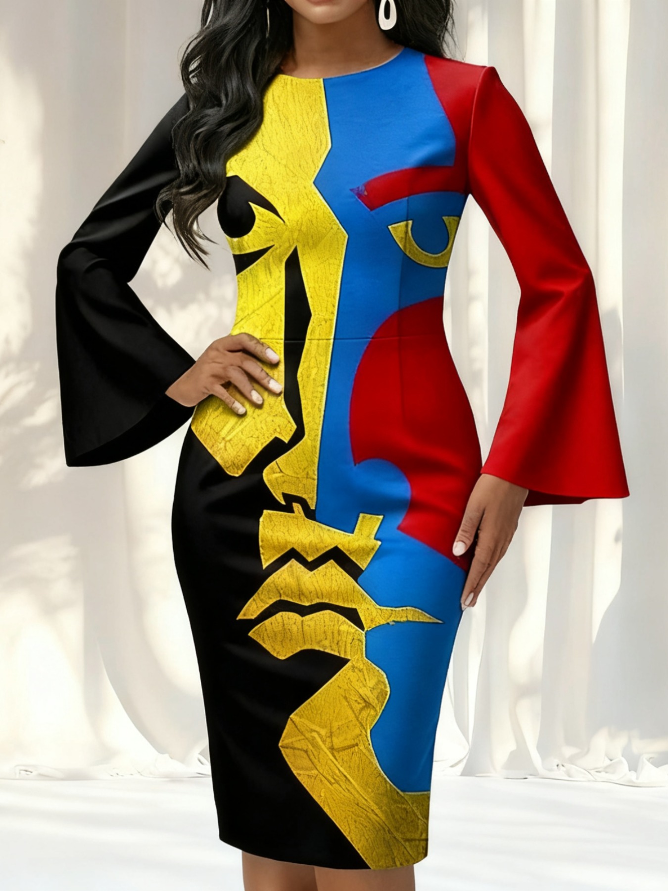 Bohemian 3D Floral & Geometric Print Pencil Skirt - A-Line Midi Length Long Sleeve-like Fit (No Waistband) Round Neck Short Dress Skirt for to Party Outfits, Psychedelic 60s/70s Style (Hand Wash/Dry Clean)