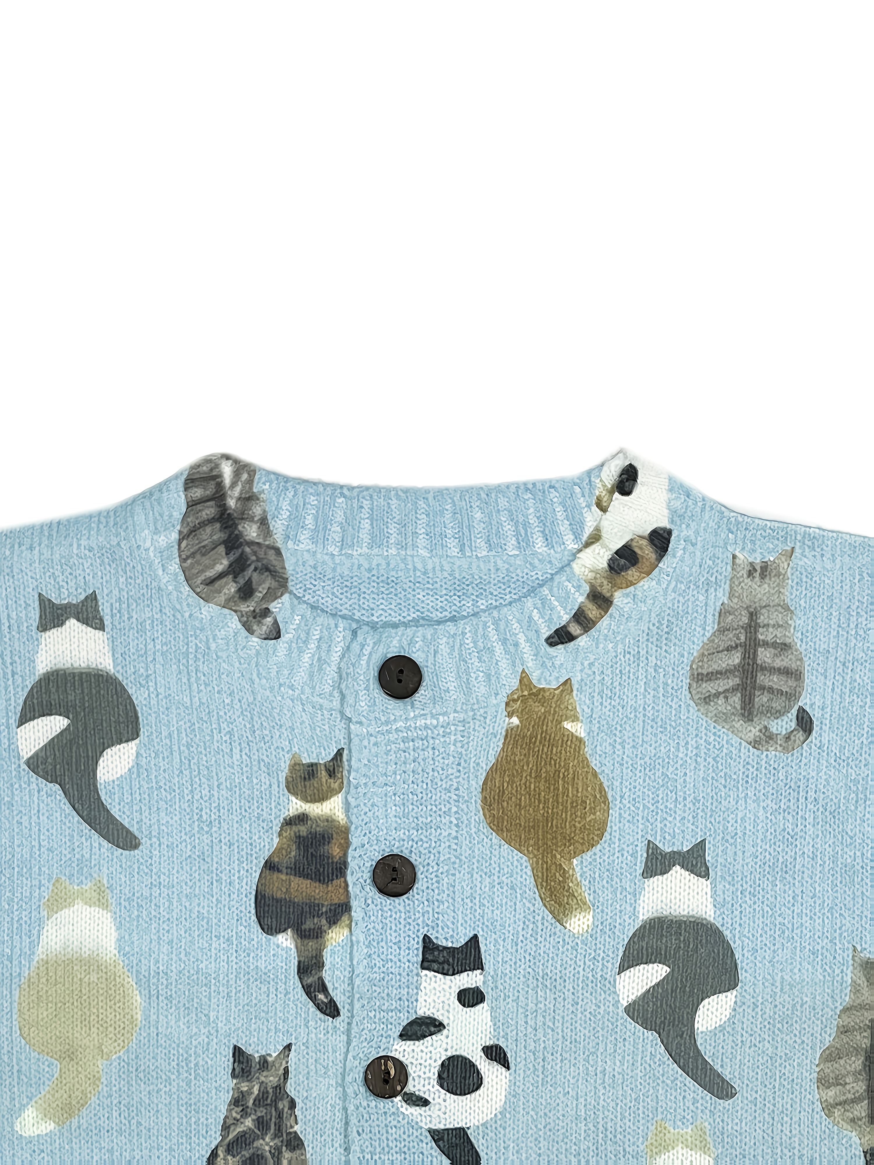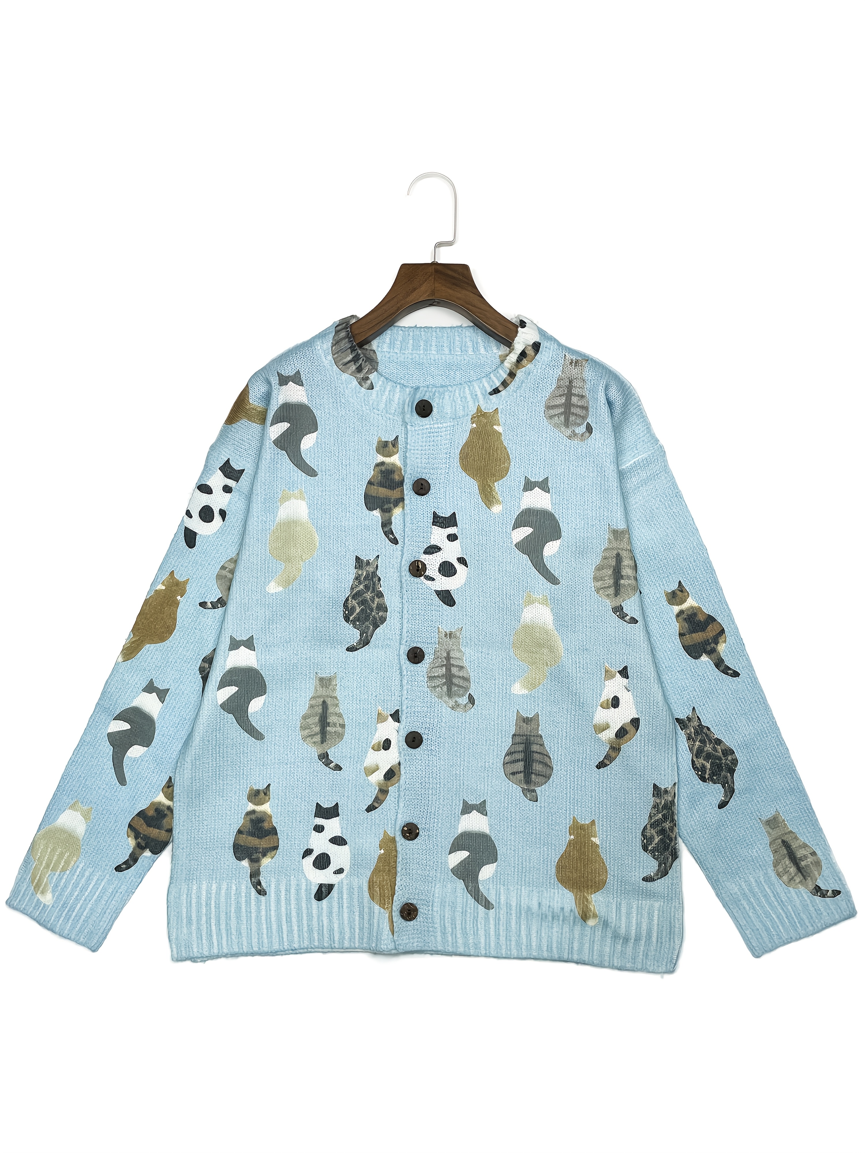 Plus Size - 2D FLAT PATTERN Plus Size, All-printed Elegant Cardigan Jacket For Cats And Dogs, Elastic Round Neck Button-front Lightweight Autumn And Winter Jacket For Women, Casual Jacket For Pet Lovers