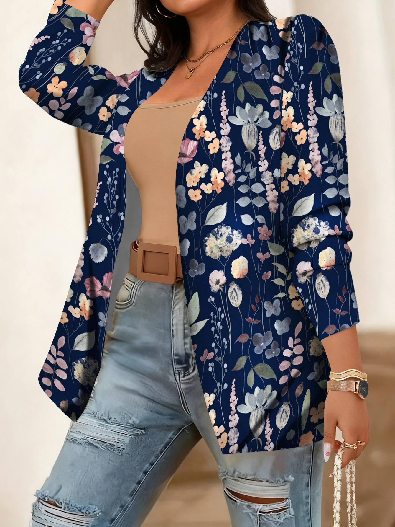 Plus Size - Plus Size Women'S Navy & Multicolor Floral Print Milk Silky Cardigan - Elegant Casual Soft Draping Coat with Fit, Machine Washable Round Neck Sweater for Fall Winter, Daily Commute, Dating & Social Events, Wrinkle-Resistant Layering Piec