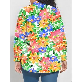 Plus Size Women'S Long Sleeve Butterfly Print Blouse | Black & White Contrast 3D Floral Design, Soft Comfortable Light Beige-Friendly Fabric, Casual Button-Up Shirt for Spring & Fall, Versatile Layering Piece, Allseason Blouse, Floral Print Top
