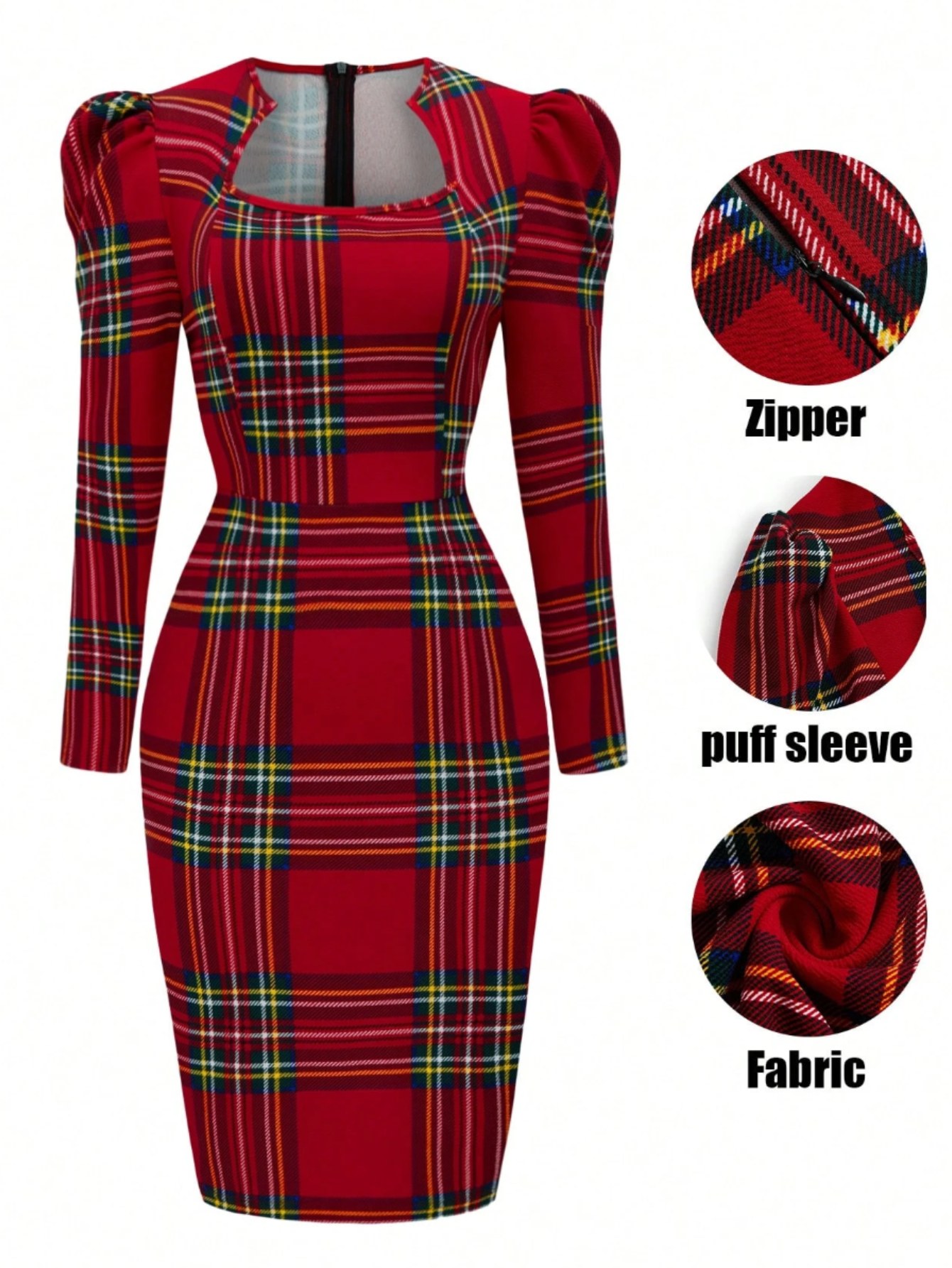 Women'S Elegant Christmas Plaid Bodycon Dress - Long Sleeve Puff Shoulder Red Tartan Checkered Pattern with Zipper Back, Boat Neck Winter Party Dress, Structured Fitted Silhouette for Xmas, New Year'S Eve & Holiday Events - Red/Green Tartan Checkere